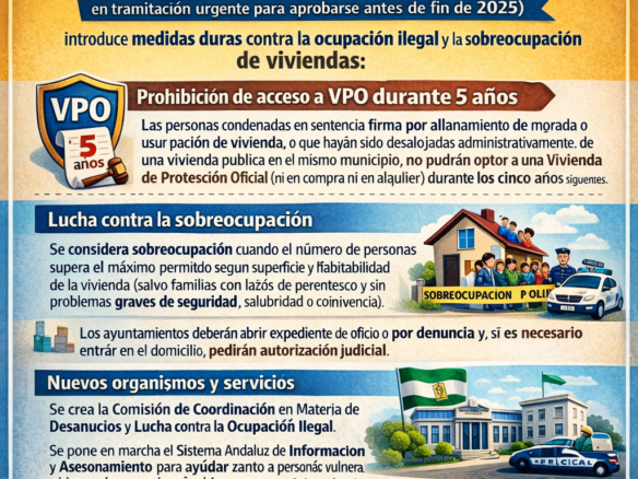 La nueva Ley de Vivienda, cuyo proyecto recoge el Boletín Oficial del Parlamento para su tramitación, recoge medidas específicas contra este fenómeno: los okupas no podrán solicitar una Vivienda de Protección Oficial (VPO) en cinco años.«No podrán ser adjudicatarias de una vivienda de promoción pública o social, en venta, las personas que en los cinco años anteriores al procedimiento de selección hayan sido condenadas, en sentencia firme, como autores de los delitos de allanamiento de morada con mantenimiento en la misma contra la voluntad de su morador o usurpación de vivienda» o «se haya emitido contra ellas resolución administrativa firme que ordene la recuperación y/o desahucio administrativo por ocupación sin título de otra vivienda de titularidad pública ubicada en el mismo municipio», recoge la normativa andaluza, cuya aprobación se tramitará por vía de urgencia para que esté antes de este año